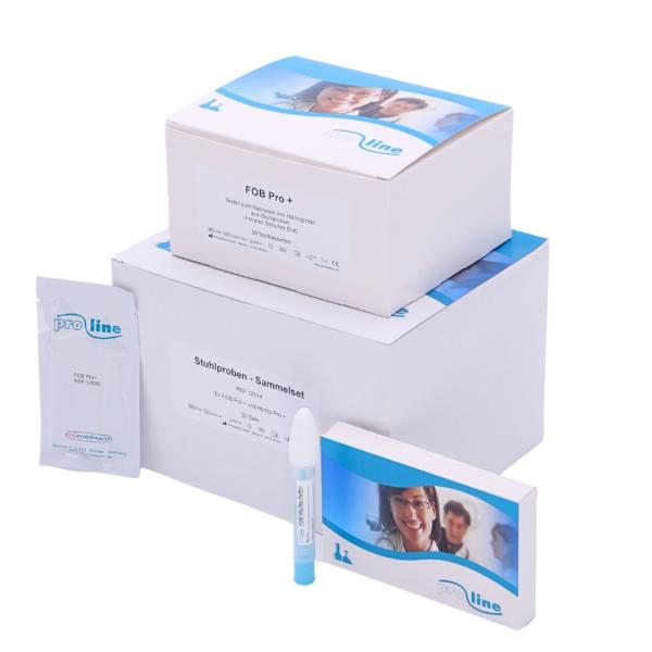 FOB PRO+ SET, bestehend aus REF 12035 (20 FOB PRO+ Testkassetten inkl Anleitung) und REF 12014 (20 Stuhlprobensammel-Set zur Abgabe an den Patienten).