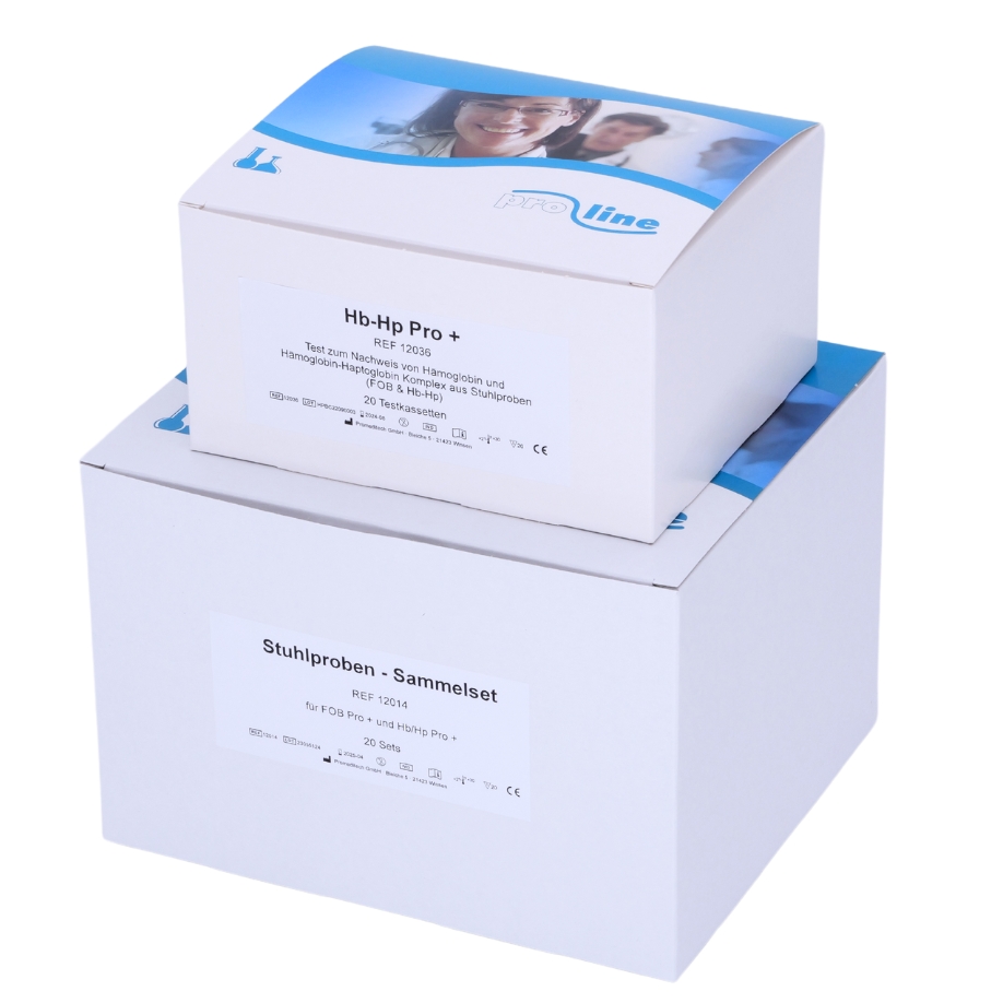 HB/HP PRO+ SET, bestehend aus REF 12036 (20 HB/HP PRO+ Testkassetten inkl Anleitung) und REF 12014 (20 Stuhlprobensammel-Set zur Abgabe an den Patienten).