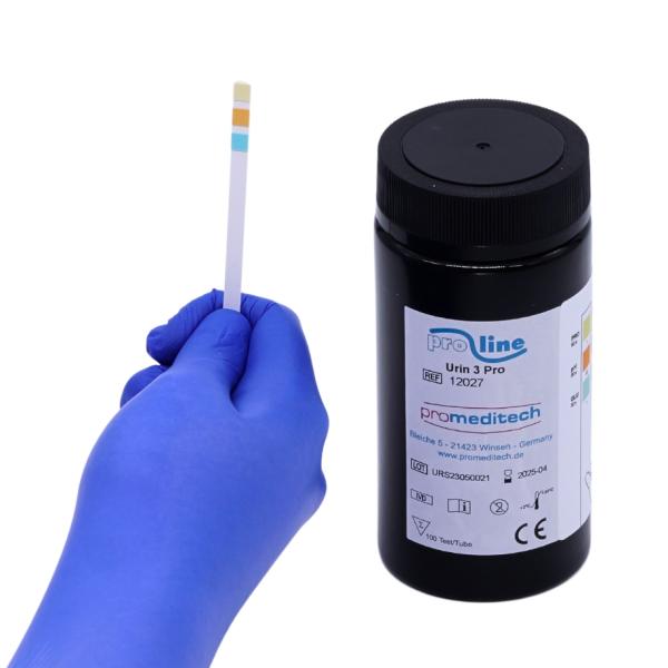 Bei dem Proline Urin 3 Pro handelt es sich um einen festen Kunststoffstreifen, auf dem sich verschiedene Reagenzzonen befinden. Der Test ist für den semiquantitativen Nachweis von Glucose, pH und Prot (EW) im Urin.